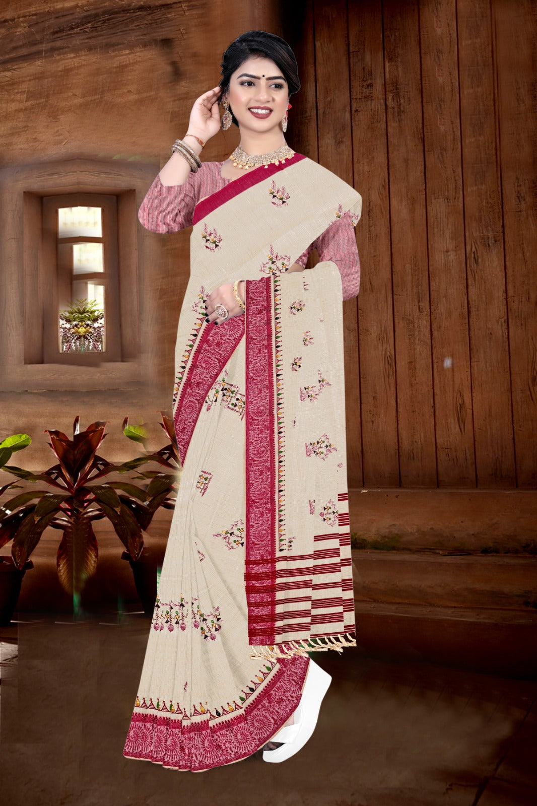 Product Name: Elegant Cotton Saree with Floral Embroidery and Border Detail