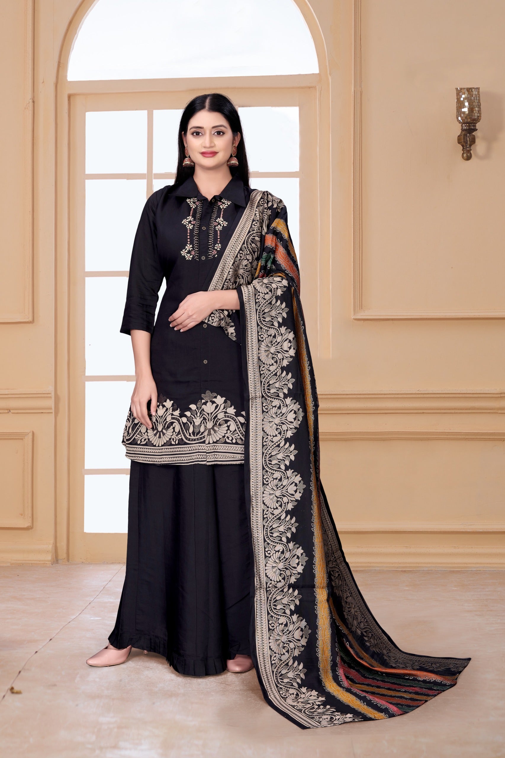 Color: Elegant black with floral embroidery and a beautifully patterned dupatta.